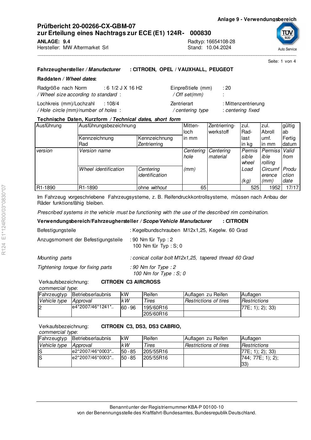 Felgengutachten / ece für Alufelgen Rial 16654108 -28 (2Jx16 ET 0, Mittenloch 0 mm) (Zertifikatsnummer e1-124r00-03-0830-07). Hier kostenlos als PDF herunterladen. Der Download-Link ist 24 Stunden gültig und kann bis zu zwei Mal verwendet werden.