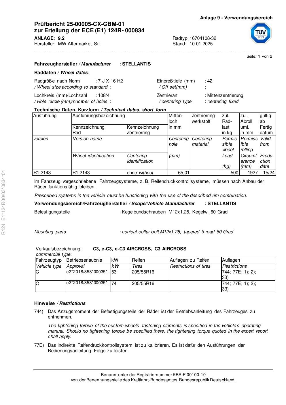 Dieses Gutachten (ece) bezieht sich auf die Alufelge Rial 16704108 -32 in der Ausführung 7Jx16 ET 0, Mittenloch 0 mm . Im PDF findest du typischerweise zulässige Reifengrößen, Auflagen/Anbauhinweise und – je nach Dokument – Hinweise zur Eintragung.