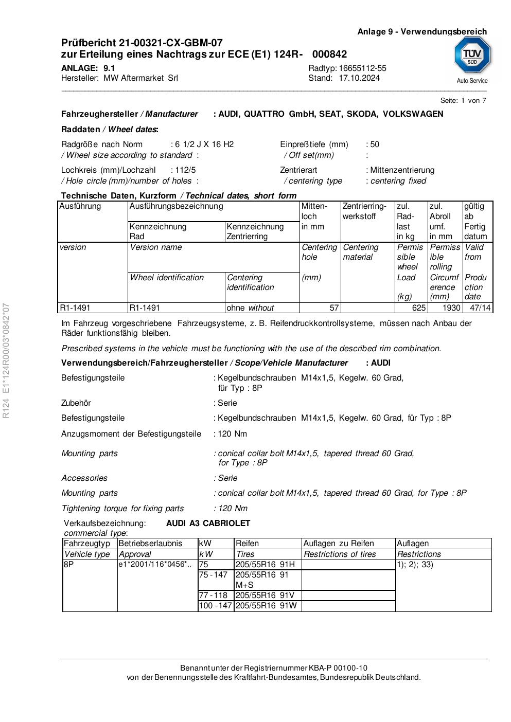 Felgengutachten / ece für Alufelgen Rial 16655112 -55 (2Jx16 ET 0, Mittenloch 0 mm) (Zertifikatsnummer e1-124r00-03-0842-07). Hier kostenlos als PDF herunterladen. Der Download-Link ist 24 Stunden gültig und kann bis zu zwei Mal verwendet werden.