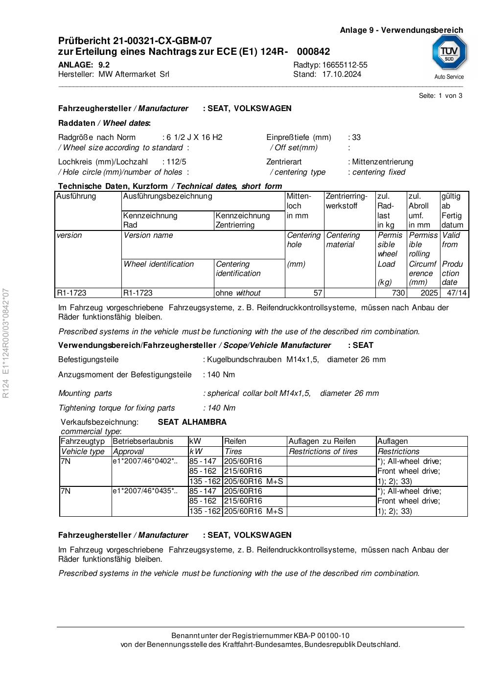 Felgengutachten / ece für Alufelgen Rial 16655112 -55 (2Jx16 ET 0, Mittenloch 0 mm) (Zertifikatsnummer e1-124r00-03-0842-07). Hier kostenlos als PDF herunterladen. Der Download-Link ist 24 Stunden gültig und kann bis zu zwei Mal verwendet werden.