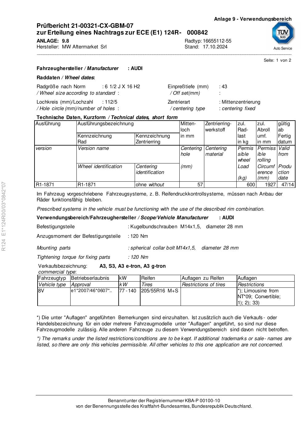 Felgengutachten / ece für Alufelgen Rial 16655112 -55 (2Jx16 ET 0, Mittenloch 0 mm) (Zertifikatsnummer e1-124r00-03-0842-07). Hier kostenlos als PDF herunterladen. Der Download-Link ist 24 Stunden gültig und kann bis zu zwei Mal verwendet werden.