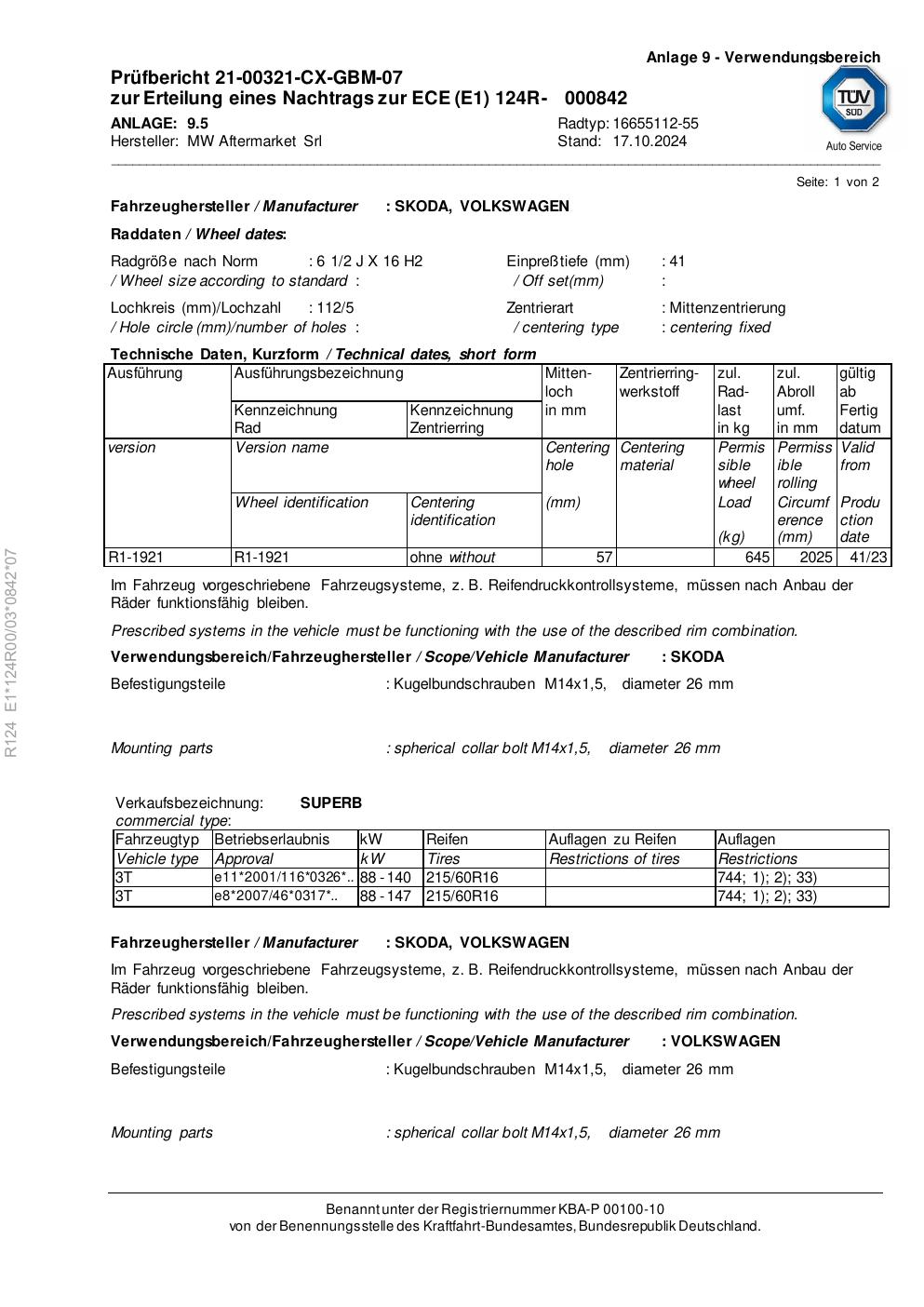 Felgengutachten / ece für Alufelgen Rial 16655112 -55 (2Jx16 ET 0, Mittenloch 0 mm) (Zertifikatsnummer e1-124r00-03-0842-07). Hier kostenlos als PDF herunterladen. Der Download-Link ist 24 Stunden gültig und kann bis zu zwei Mal verwendet werden.