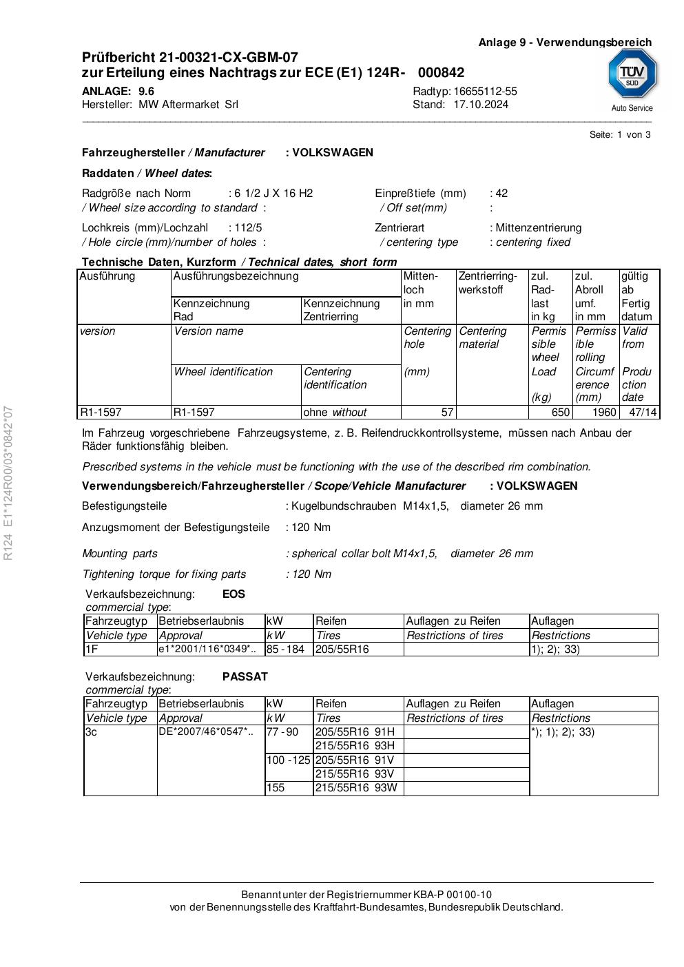 Felgengutachten / ece für Alufelgen Rial 16655112 -55 (2Jx16 ET 0, Mittenloch 0 mm) (Zertifikatsnummer e1-124r00-03-0842-07). Hier kostenlos als PDF herunterladen. Der Download-Link ist 24 Stunden gültig und kann bis zu zwei Mal verwendet werden.