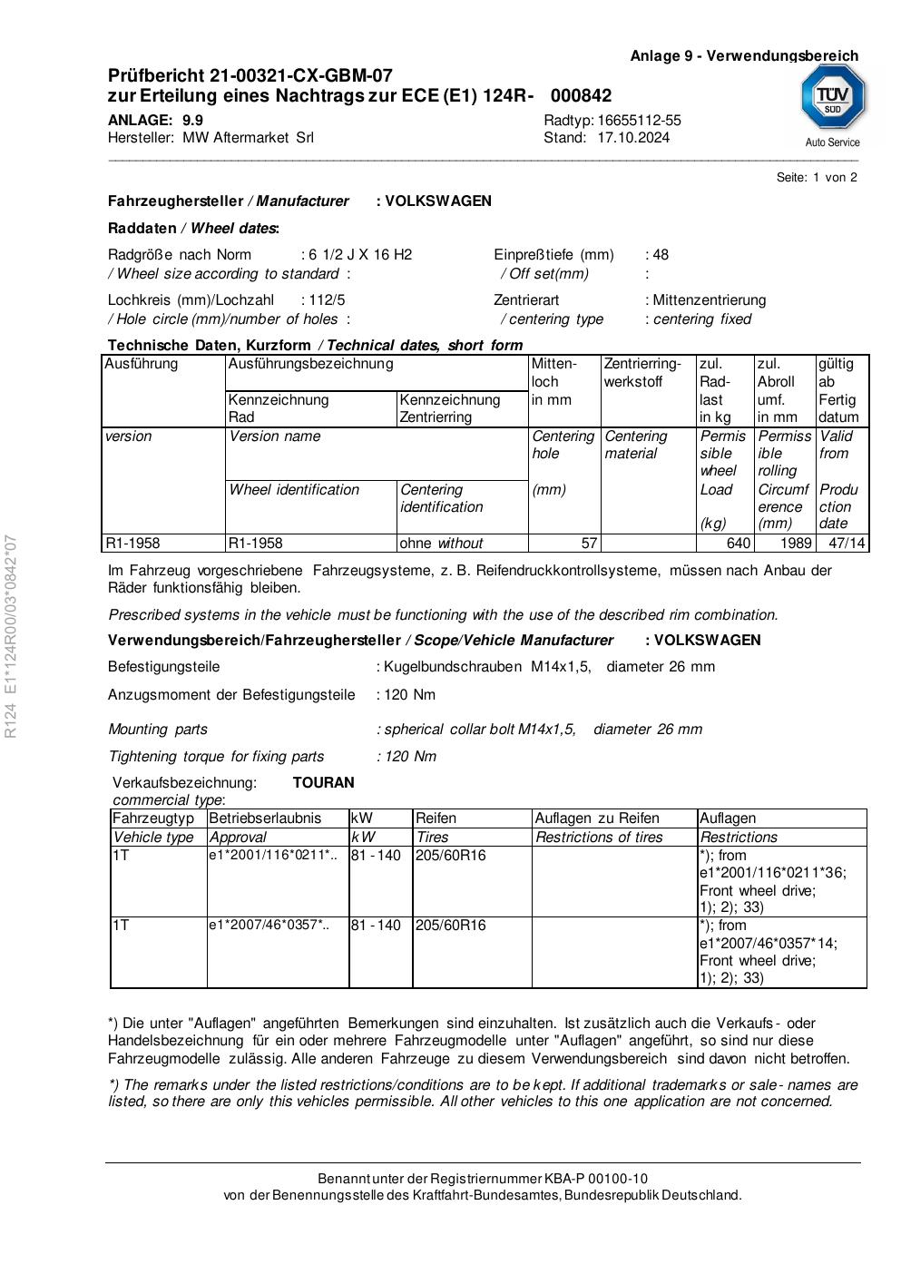 Felgengutachten / ece für Alufelgen Rial 16655112 -55 (2Jx16 ET 0, Mittenloch 0 mm) (Zertifikatsnummer e1-124r00-03-0842-07). Hier kostenlos als PDF herunterladen. Der Download-Link ist 24 Stunden gültig und kann bis zu zwei Mal verwendet werden.