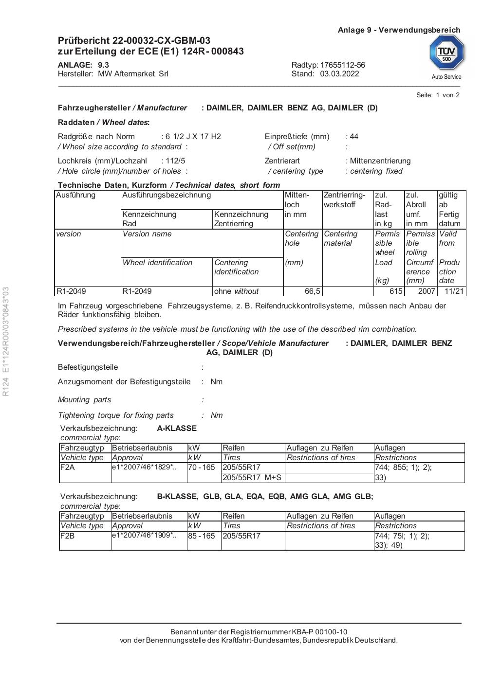 Felgengutachten / ece für Alufelgen Rial 17655112-56 (2Jx17 ET 0, Mittenloch 0 mm) (Zertifikatsnummer e1-124r00-03-0843-03). Hier kostenlos als PDF herunterladen. Der Download-Link ist 24 Stunden gültig und kann bis zu zwei Mal verwendet werden.