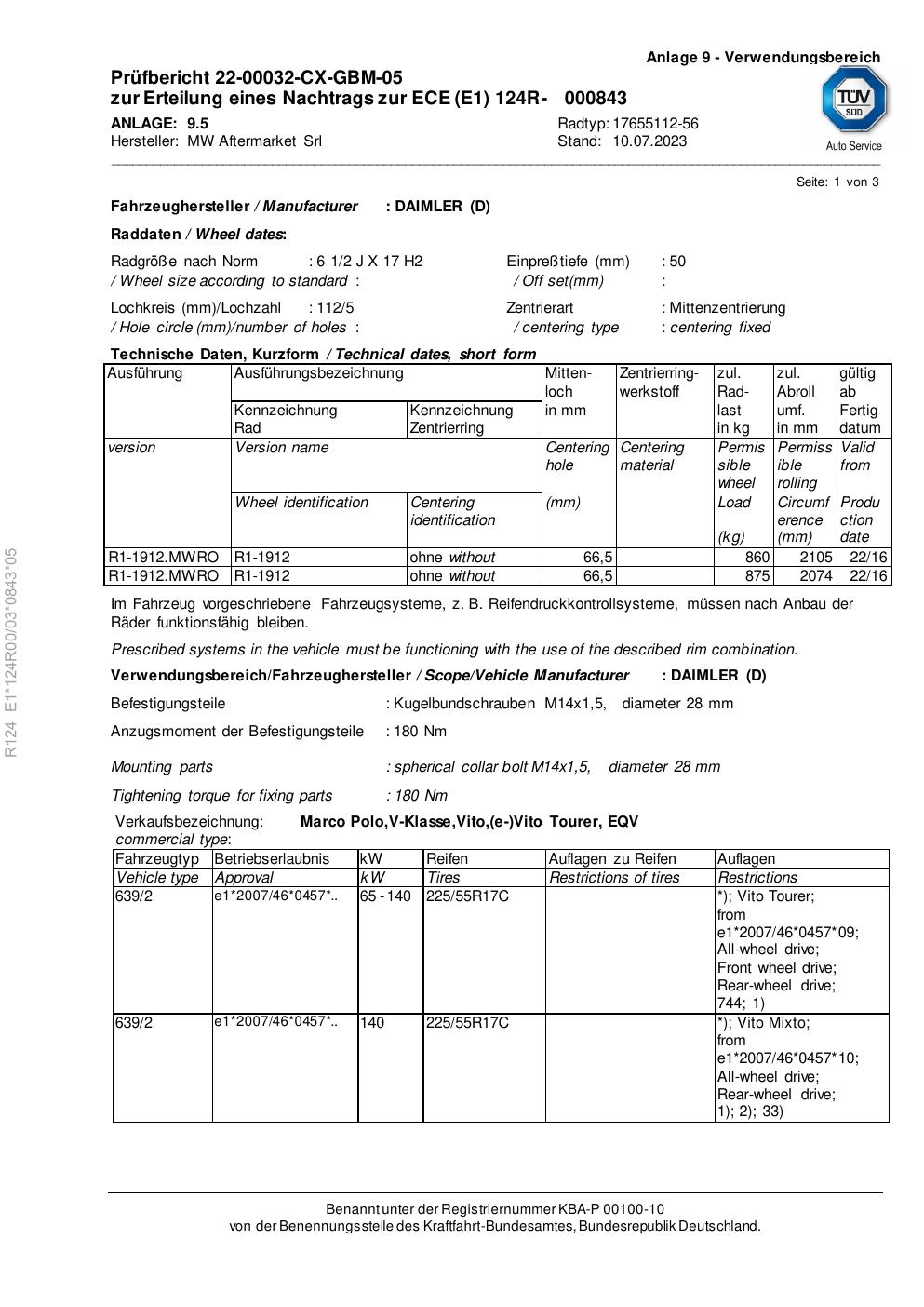 Felgengutachten / ece für Alufelgen Rial 17655112 -56 (2Jx17 ET 0, Mittenloch 0 mm) (Zertifikatsnummer e1-124r00-03-0843-05). Hier kostenlos als PDF herunterladen. Der Download-Link ist 24 Stunden gültig und kann bis zu zwei Mal verwendet werden.