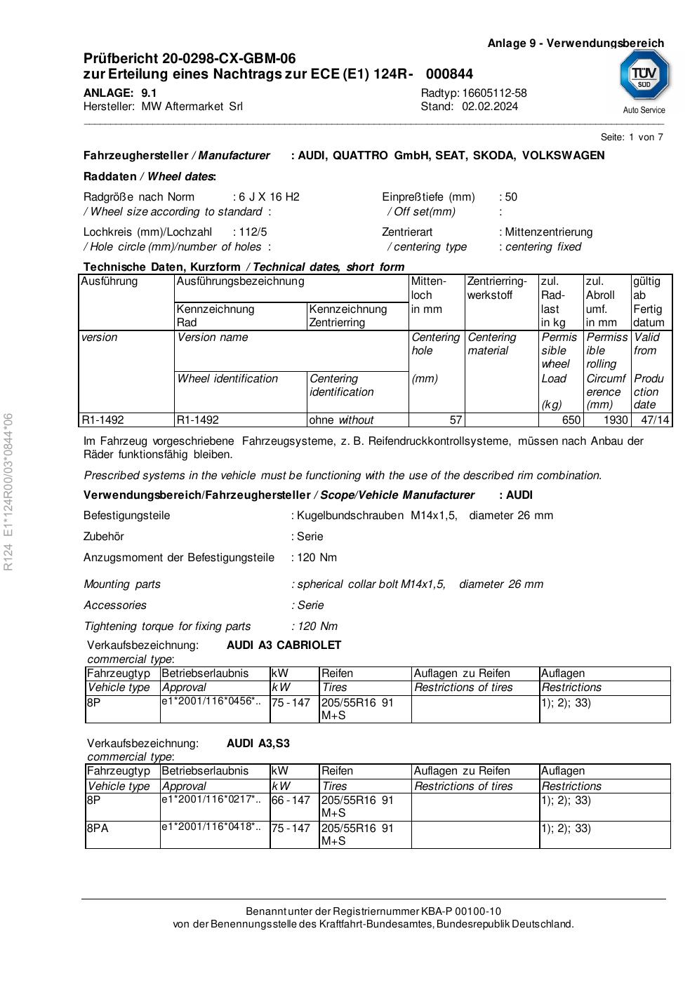 Felgengutachten / ece für Alufelgen Rial 16605112 -58 (6Jx16 ET 0, Mittenloch 0 mm) (Zertifikatsnummer e1-124r00-03-0844-06). Hier kostenlos als PDF herunterladen. Der Download-Link ist 24 Stunden gültig und kann bis zu zwei Mal verwendet werden.
