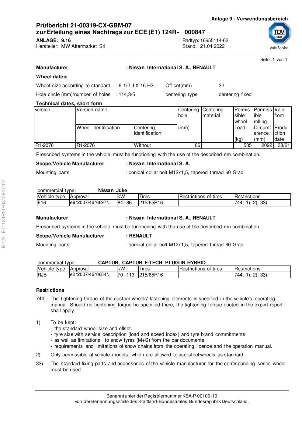 Dieses Gutachten (ece) bezieht sich auf die Alufelge Rial 16655114 -62 in der Ausführung 2Jx16 ET 0, Mittenloch 0 mm . Im PDF findest du typischerweise zulässige Reifengrößen, Auflagen/Anbauhinweise und – je nach Dokument – Hinweise zur Eintragung.