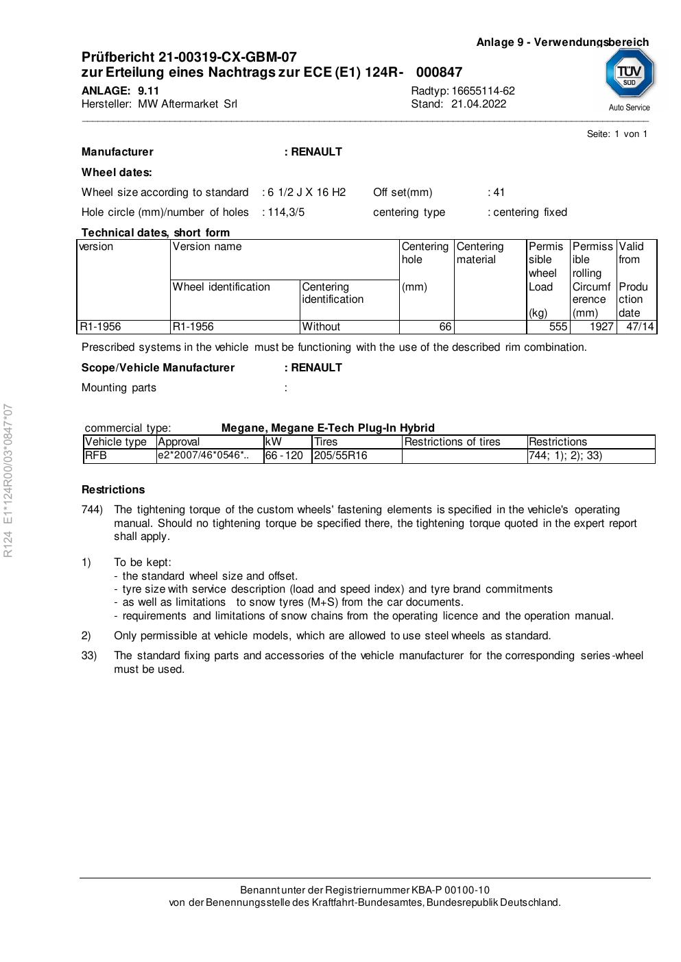Dieses Gutachten (ece) bezieht sich auf die Alufelge Rial 16655114 -62 in der Ausführung 2Jx16 ET 0, Mittenloch 0 mm . Im PDF findest du typischerweise zulässige Reifengrößen, Auflagen/Anbauhinweise und – je nach Dokument – Hinweise zur Eintragung.