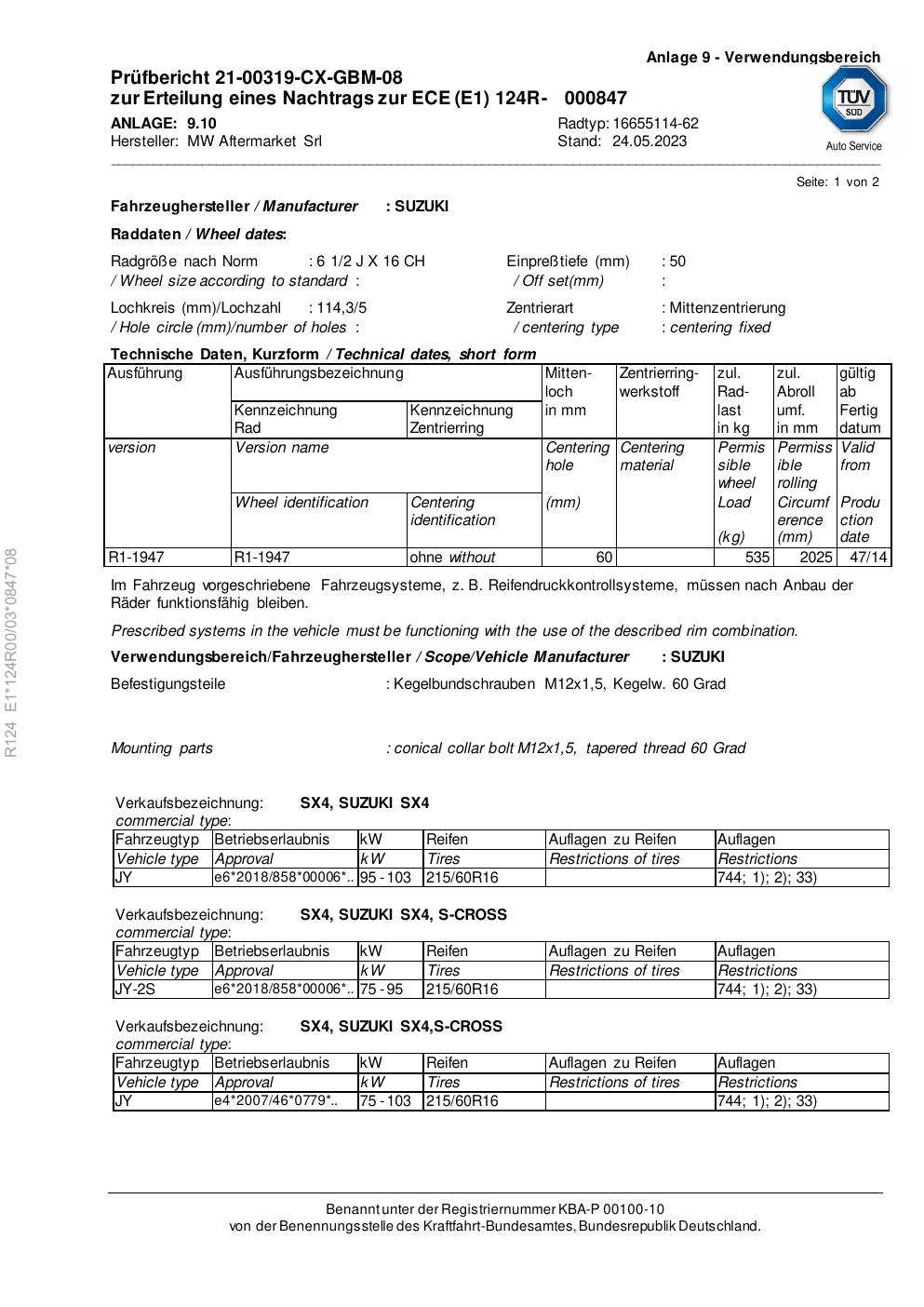 Felgengutachten / ece für Alufelgen Rial 16655114 -62 (2Jx16 ET 0, Mittenloch 0 mm) (Zertifikatsnummer e1-124r00-03-0847-08). Hier kostenlos als PDF herunterladen. Der Download-Link ist 24 Stunden gültig und kann bis zu zwei Mal verwendet werden.