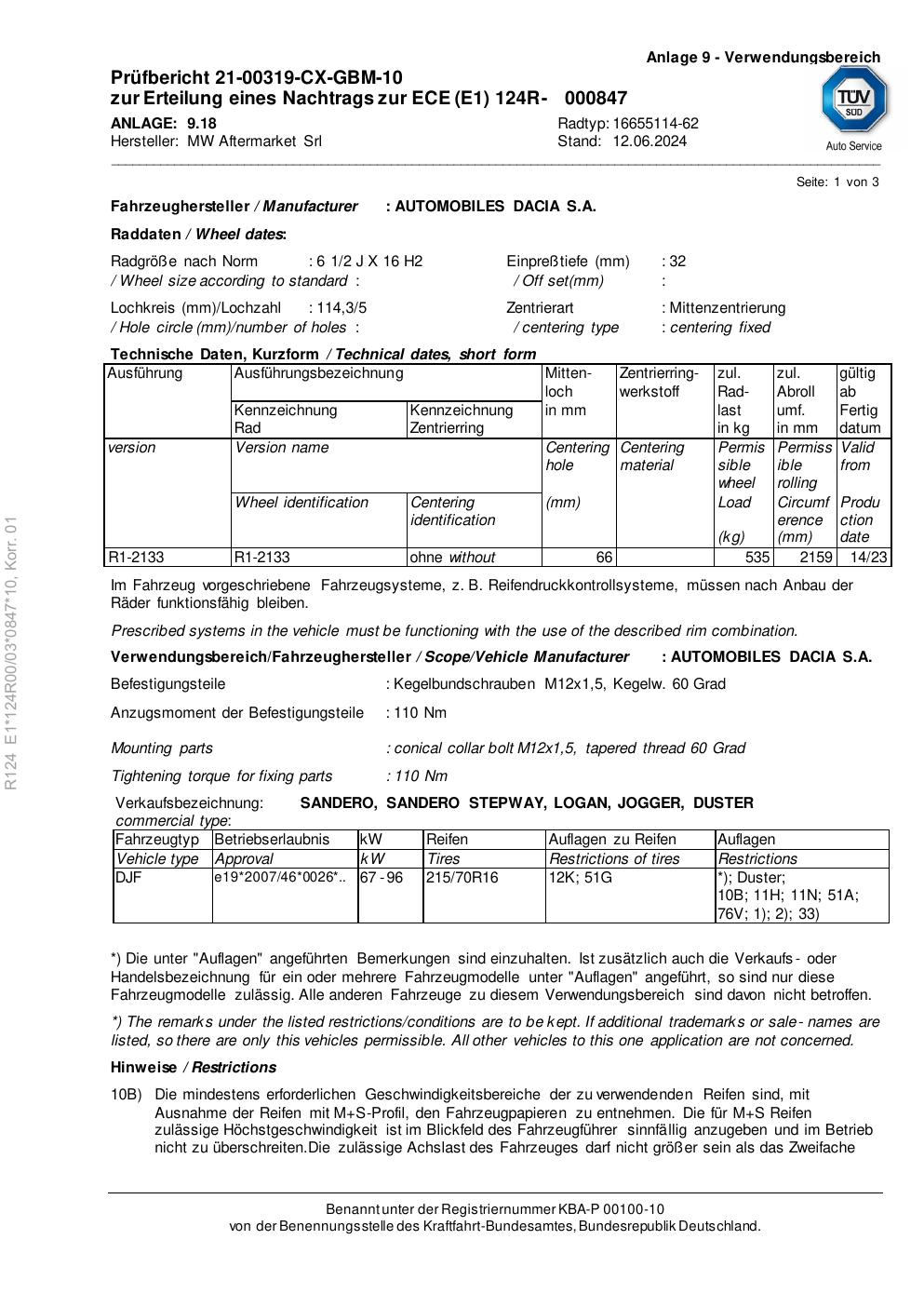 Dieses Gutachten (ece) bezieht sich auf die Alufelge Rial 16655114 -62 in der Ausführung 2Jx16 ET 0, Mittenloch 0 mm . Im PDF findest du typischerweise zulässige Reifengrößen, Auflagen/Anbauhinweise und – je nach Dokument – Hinweise zur Eintragung.