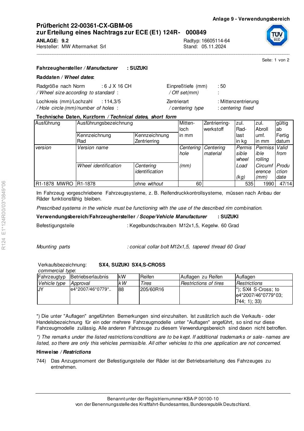Dieses Gutachten (ece) bezieht sich auf die Alufelge Rial 16605114 -64 in der Ausführung 6Jx16 ET 0, Mittenloch 0 mm . Im PDF findest du typischerweise zulässige Reifengrößen, Auflagen/Anbauhinweise und – je nach Dokument – Hinweise zur Eintragung.