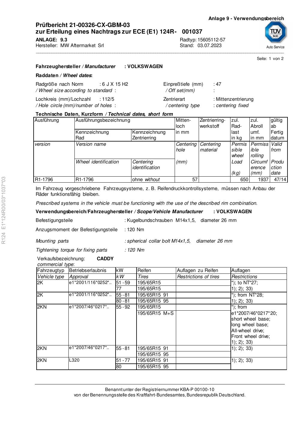 Felgengutachten / ece für Alufelgen Rial 15605112 -57 (6Jx15 ET 0, Mittenloch 0 mm) (Zertifikatsnummer e1-124r00-03-1037-03). Hier kostenlos als PDF herunterladen. Der Download-Link ist 24 Stunden gültig und kann bis zu zwei Mal verwendet werden.