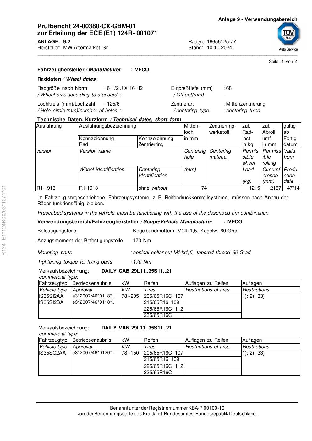 Felgengutachten / ece für Alufelgen Rial 16656125 -77 (2Jx16 ET 0, Mittenloch 0 mm) (Zertifikatsnummer e1-124r00-03-1071-01). Hier kostenlos als PDF herunterladen. Der Download-Link ist 24 Stunden gültig und kann bis zu zwei Mal verwendet werden.