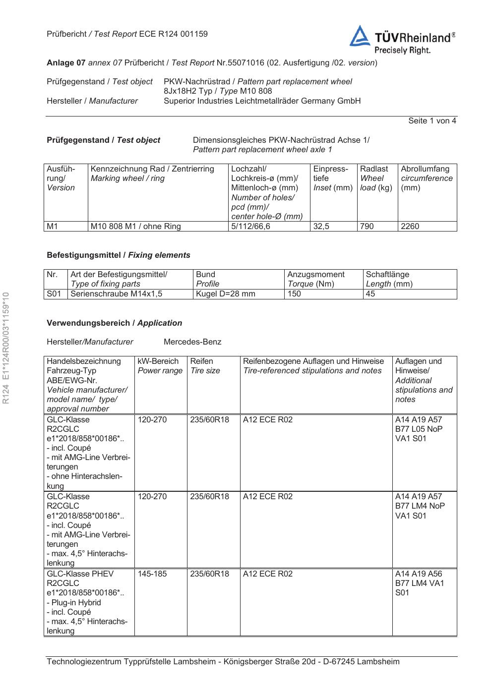 Felgengutachten / ece für Alufelgen Superior M10 808 (8Jx18 ET 0, Mittenloch 0 mm) (Zertifikatsnummer e1-124r00-03-1159-10). Hier kostenlos als PDF herunterladen. Der Download-Link ist 24 Stunden gültig und kann bis zu zwei Mal verwendet werden.