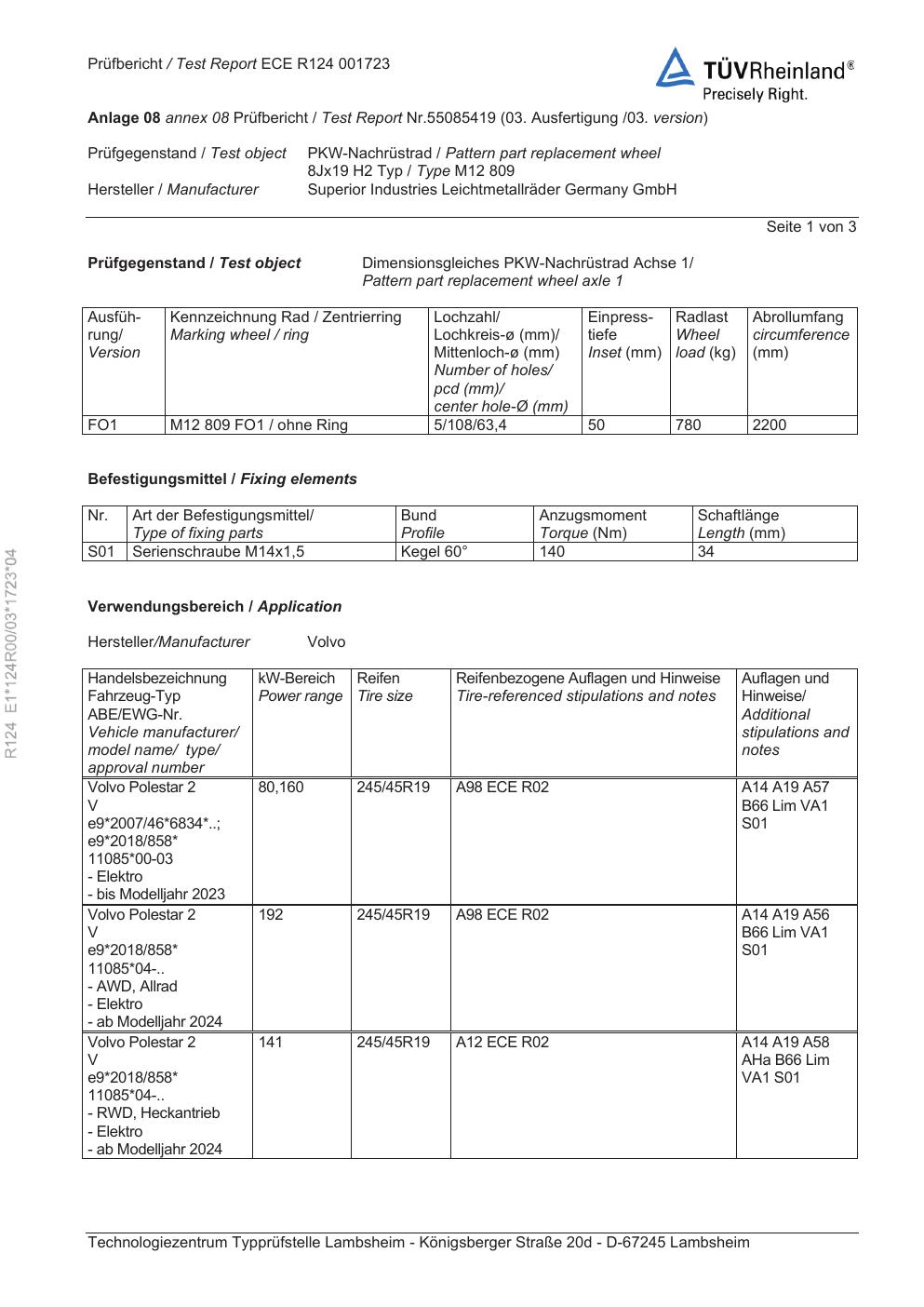 Dieses Gutachten (ece) bezieht sich auf die Alufelge Rial e M12 809 in der Ausführung 8Jx19 ET 0, Mittenloch 0 mm . Im PDF findest du typischerweise zulässige Reifengrößen, Auflagen/Anbauhinweise und – je nach Dokument – Hinweise zur Eintragung.