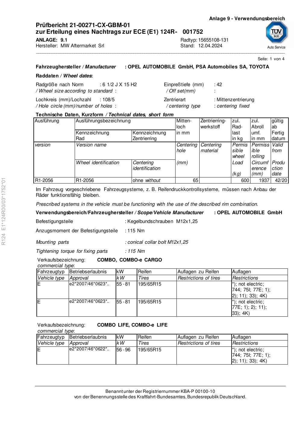 Felgengutachten / ece für Alufelgen Rial 15655108 -131 (2Jx15 ET 0, Mittenloch 0 mm) (Zertifikatsnummer e1-124r00-03-1752-01). Hier kostenlos als PDF herunterladen. Der Download-Link ist 24 Stunden gültig und kann bis zu zwei Mal verwendet werden.
