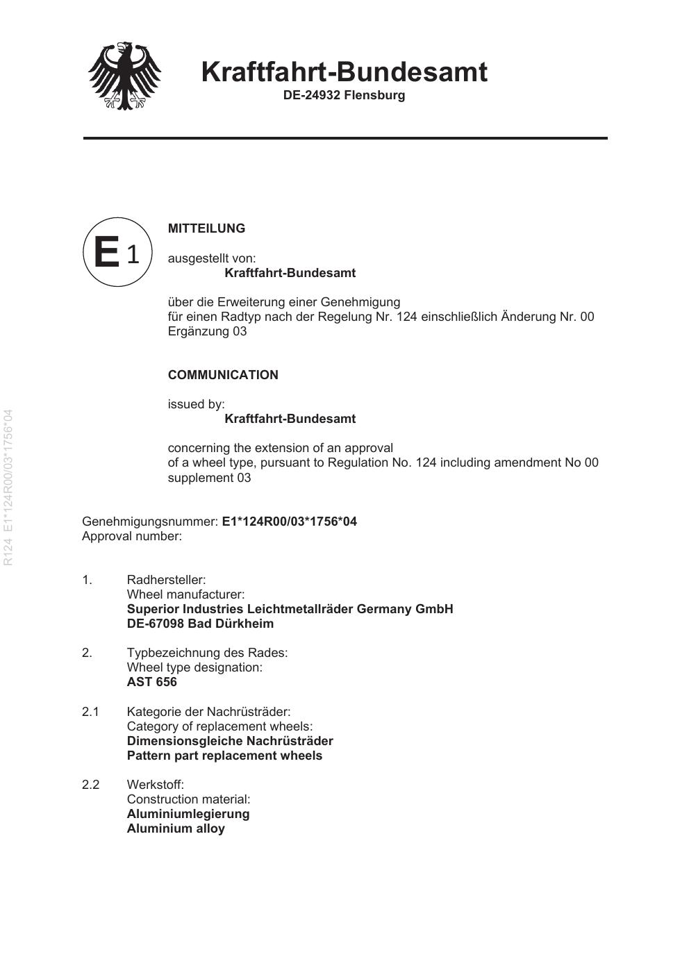 Felgengutachten / ece für Alufelgen Rial AST (6.5Jx16 ET 0, Mittenloch 0 mm) (Zertifikatsnummer e1-124r00-03-1756-04). Hier kostenlos als PDF herunterladen. Der Download-Link ist 24 Stunden gültig und kann bis zu zwei Mal verwendet werden.