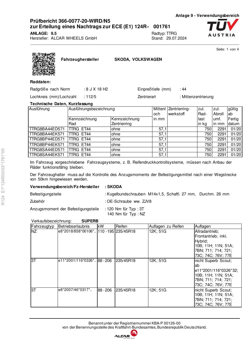 Dieses Gutachten (ece) bezieht sich auf die Alufelge alcar TTRG in der Ausführung 8Jx18 ET 0, Mittenloch 0 mm . Im PDF findest du typischerweise zulässige Reifengrößen, Auflagen/Anbauhinweise und – je nach Dokument – Hinweise zur Eintragung.