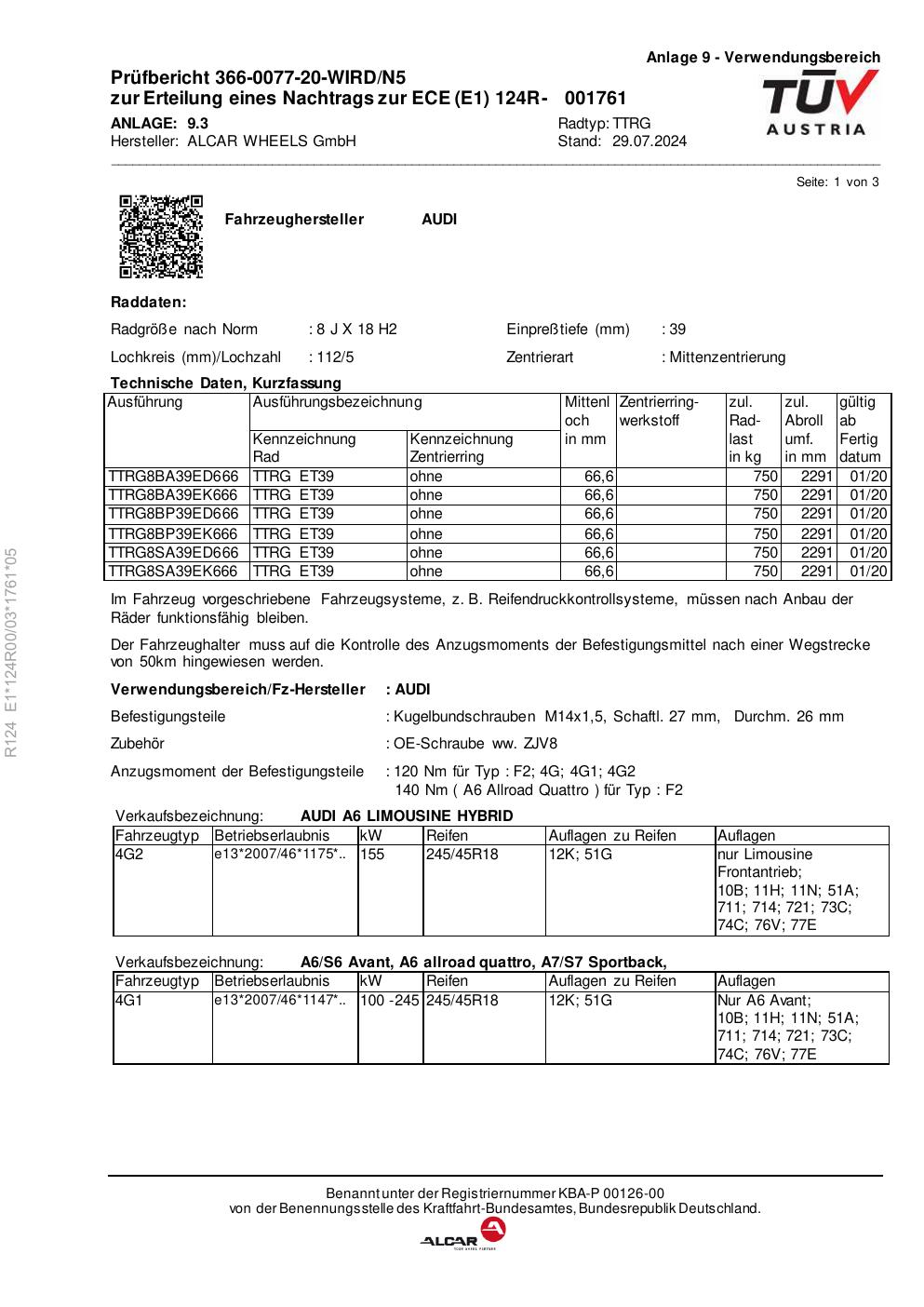 Dieses Gutachten (ece) bezieht sich auf die Alufelge alcar TTRG in der Ausführung 8Jx18 ET 0, Mittenloch 0 mm . Im PDF findest du typischerweise zulässige Reifengrößen, Auflagen/Anbauhinweise und – je nach Dokument – Hinweise zur Eintragung.