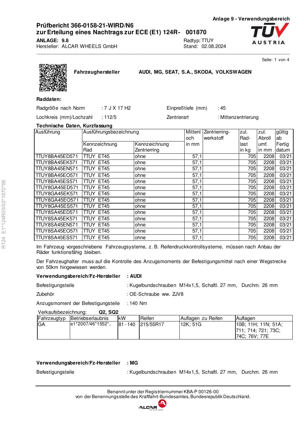 Dieses Gutachten (ece) bezieht sich auf die Alufelge alcar TTUY in der Ausführung 7Jx17 ET 0, Mittenloch 0 mm . Im PDF findest du typischerweise zulässige Reifengrößen, Auflagen/Anbauhinweise und – je nach Dokument – Hinweise zur Eintragung.