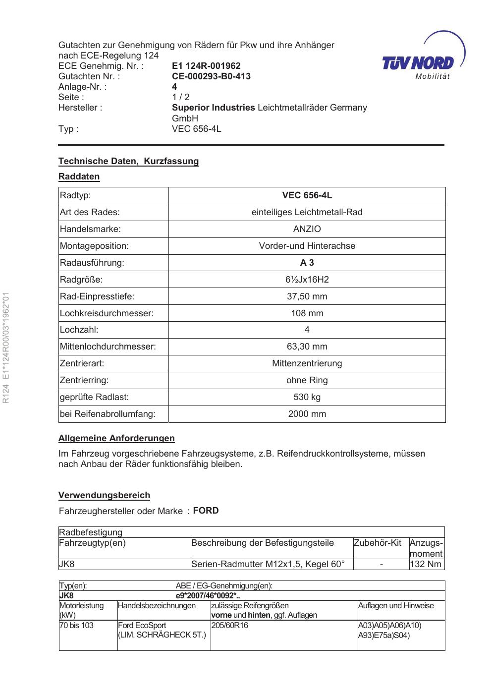 Felgengutachten / ece für Alufelgen brand-anzio VEC 656 (ET 0, Mittenloch 0 mm) (Zertifikatsnummer e1-124r00-03-1962-01). Hier kostenlos als PDF herunterladen. Der Download-Link ist 24 Stunden gültig und kann bis zu zwei Mal verwendet werden.