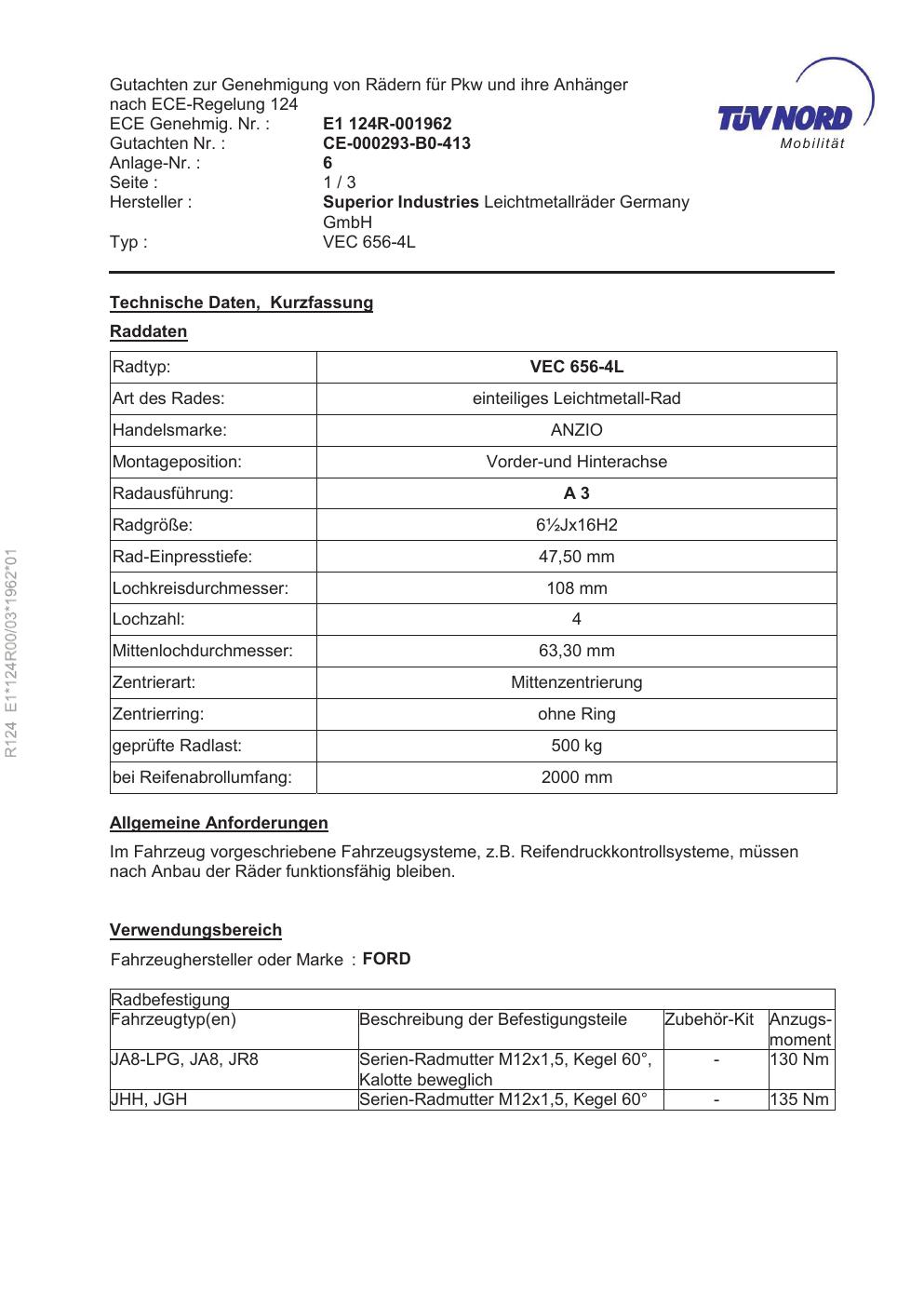 Felgengutachten / ece für Alufelgen brand-anzio VEC 656 (ET 0, Mittenloch 0 mm) (Zertifikatsnummer e1-124r00-03-1962-01). Hier kostenlos als PDF herunterladen. Der Download-Link ist 24 Stunden gültig und kann bis zu zwei Mal verwendet werden.