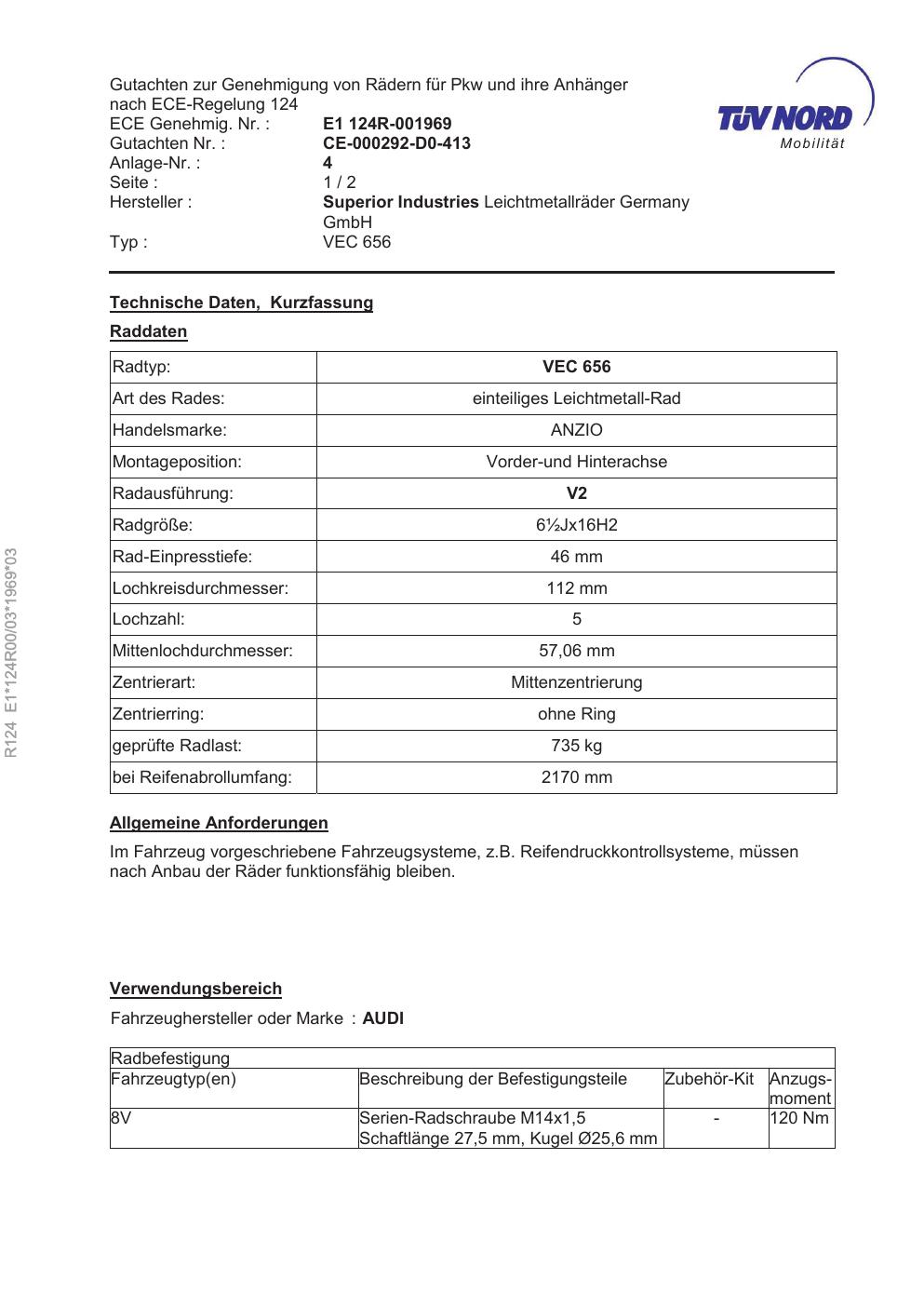 Felgengutachten / ece für Alufelgen brand-anzio VEC 656 Mobilit (ET 0, Mittenloch 0 mm) (Zertifikatsnummer e1-124r00-03-1969-03). Hier kostenlos als PDF herunterladen. Der Download-Link ist 24 Stunden gültig und kann bis zu zwei Mal verwendet werden.