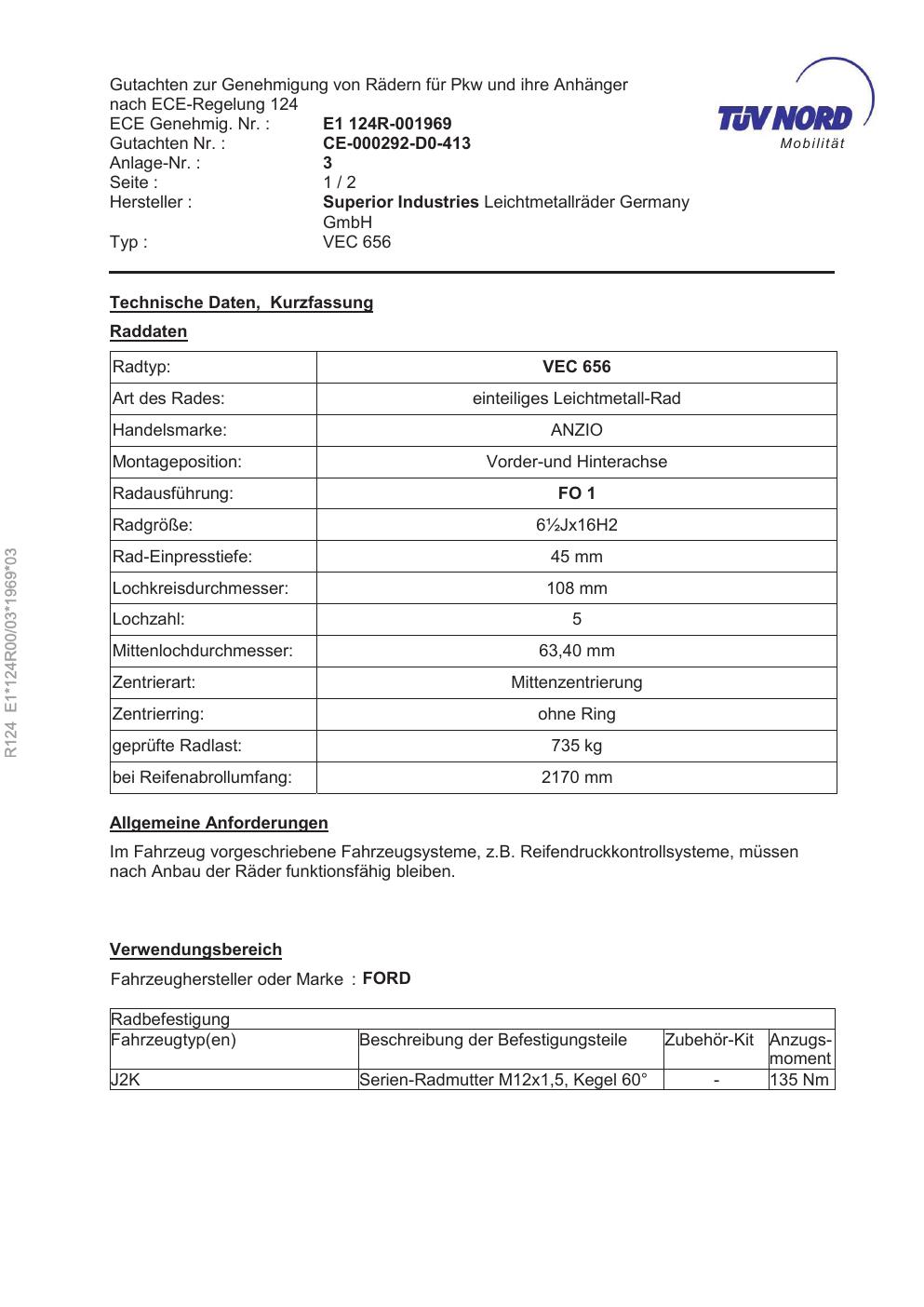 Felgengutachten / ece für Alufelgen brand-anzio VEC 656 Mobilit (ET 0, Mittenloch 0 mm) (Zertifikatsnummer e1-124r00-03-1969-03). Hier kostenlos als PDF herunterladen. Der Download-Link ist 24 Stunden gültig und kann bis zu zwei Mal verwendet werden.