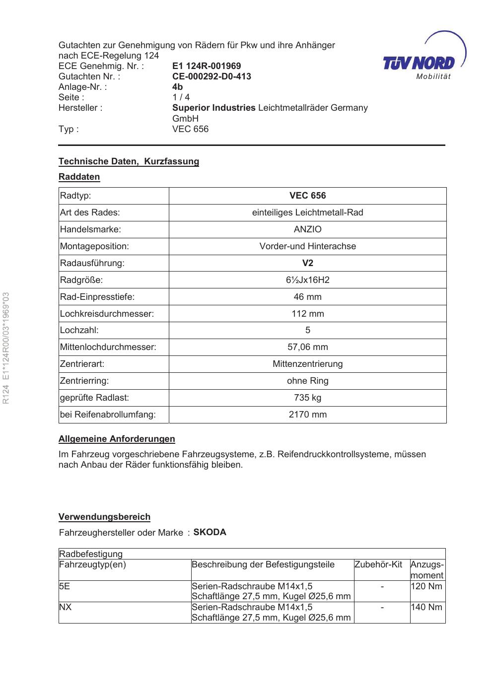 Felgengutachten / ece für Alufelgen brand-anzio VEC 656 Mobilit (ET 0, Mittenloch 0 mm) (Zertifikatsnummer e1-124r00-03-1969-03). Hier kostenlos als PDF herunterladen. Der Download-Link ist 24 Stunden gültig und kann bis zu zwei Mal verwendet werden.