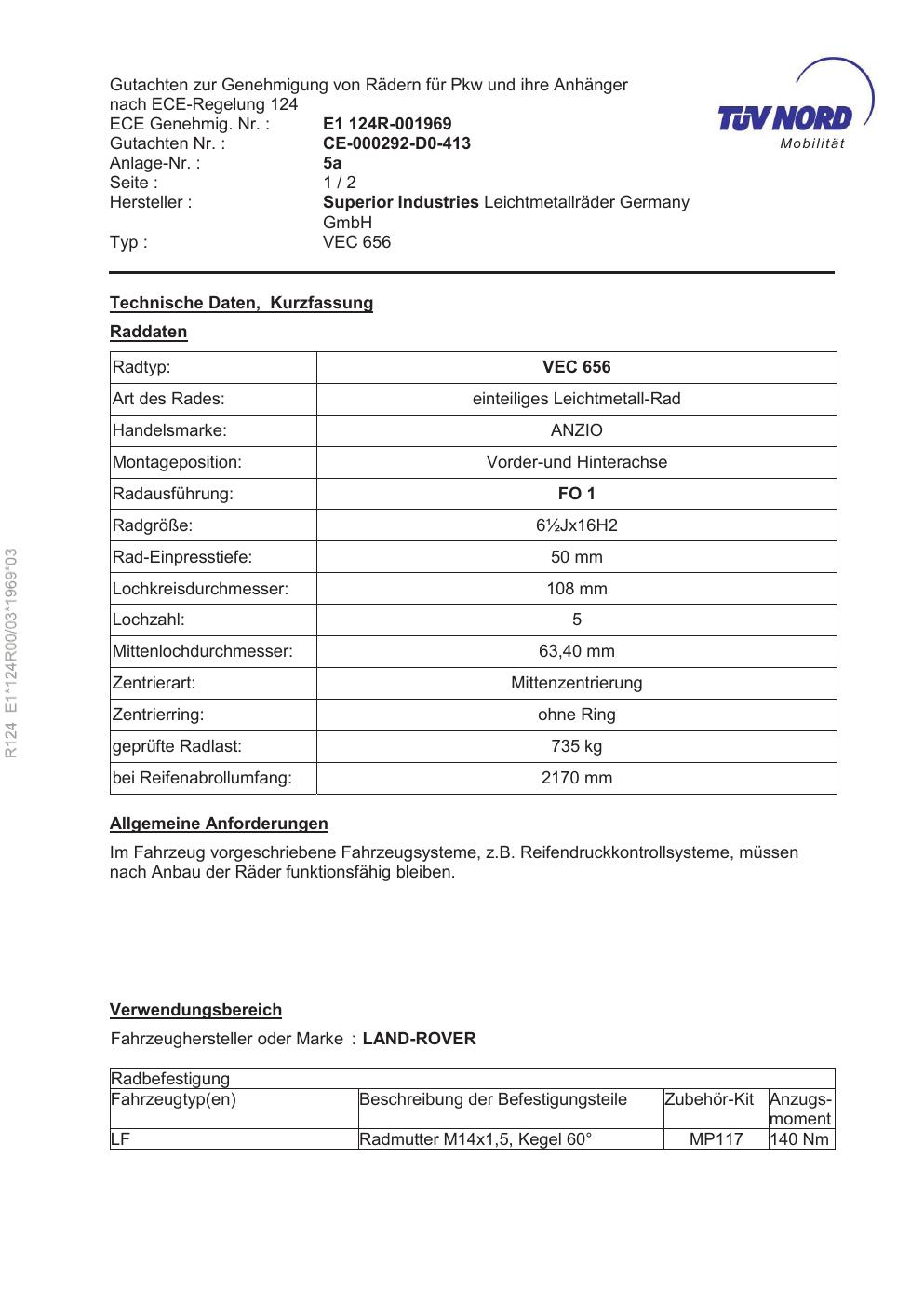 Dieses Gutachten (ece) bezieht sich auf die Alufelge brand-anzio VEC 656 Mobilit in der Ausführung ET 0, Mittenloch 0 mm . Im PDF findest du typischerweise zulässige Reifengrößen, Auflagen/Anbauhinweise und – je nach Dokument – Hinweise zur Eintragung.