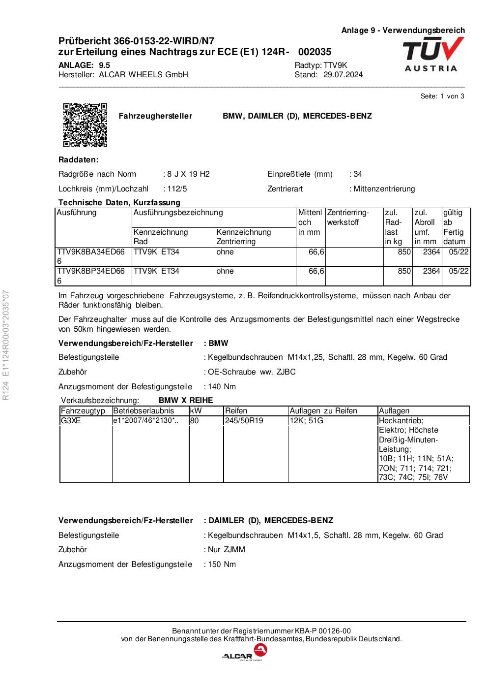 Felgengutachten / ece für Alufelgen alcar TTV9K (8Jx19 ET 0, Mittenloch 0 mm) (Zertifikatsnummer e1-124r00-03-2035-07). Hier kostenlos als PDF herunterladen. Der Download-Link ist 24 Stunden gültig und kann bis zu zwei Mal verwendet werden.