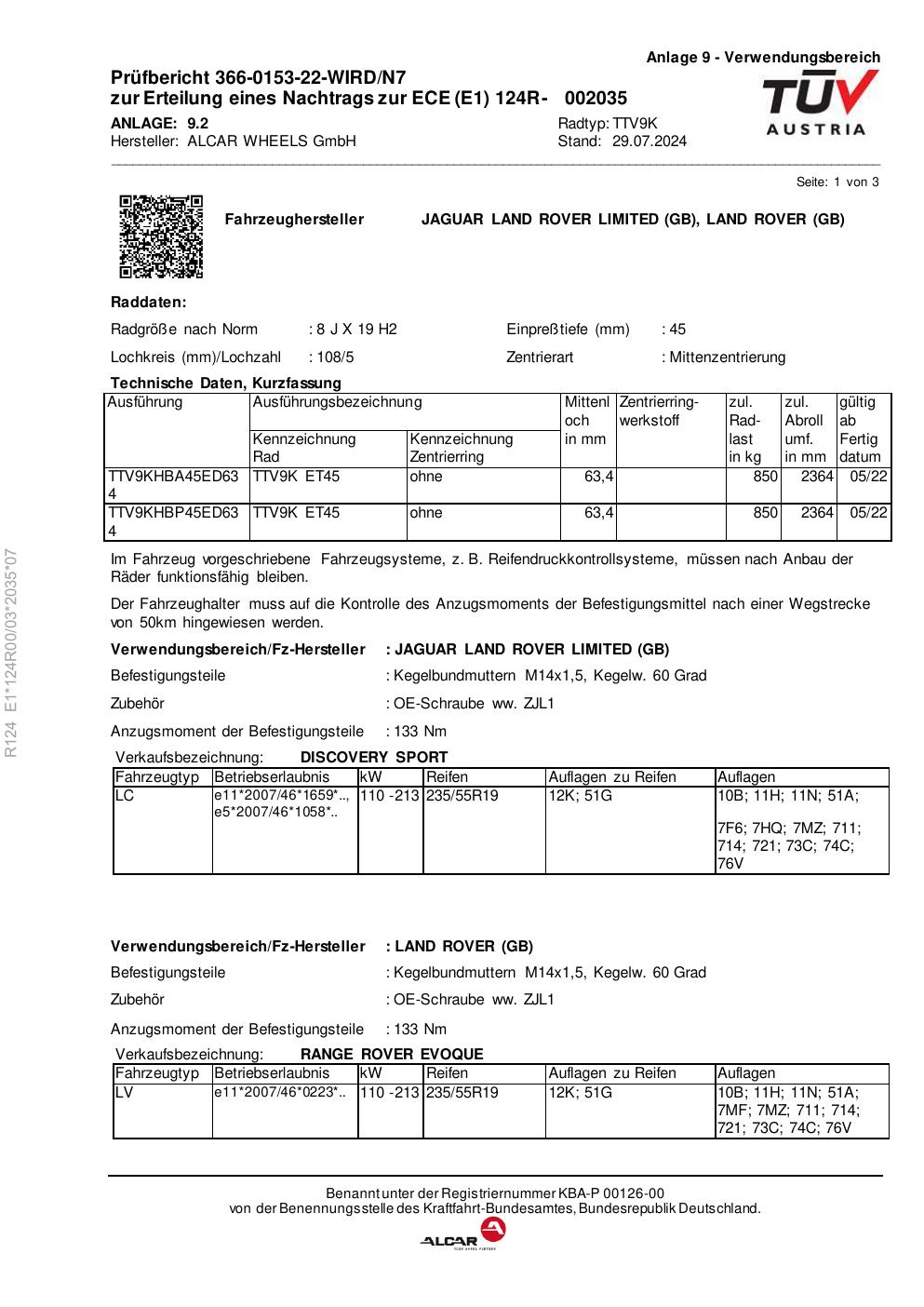 Felgengutachten / ece für Alufelgen alcar TTV9K (8Jx19 ET 0, Mittenloch 0 mm) (Zertifikatsnummer e1-124r00-03-2035-07). Hier kostenlos als PDF herunterladen. Der Download-Link ist 24 Stunden gültig und kann bis zu zwei Mal verwendet werden.