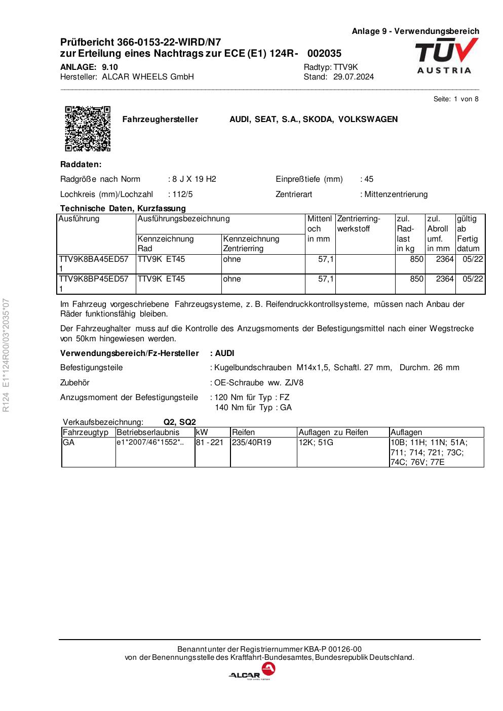 Dieses Gutachten (ece) bezieht sich auf die Alufelge alcar TTV9K in der Ausführung 8Jx19 ET 0, Mittenloch 0 mm . Im PDF findest du typischerweise zulässige Reifengrößen, Auflagen/Anbauhinweise und – je nach Dokument – Hinweise zur Eintragung.