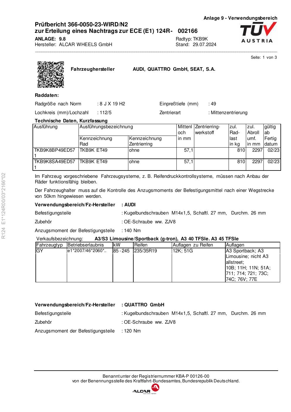 Felgengutachten / ece für Alufelgen alcar TKB9K (8Jx19 ET 0, Mittenloch 0 mm) (Zertifikatsnummer e1-124r00-03-2166-02). Hier kostenlos als PDF herunterladen. Der Download-Link ist 24 Stunden gültig und kann bis zu zwei Mal verwendet werden.