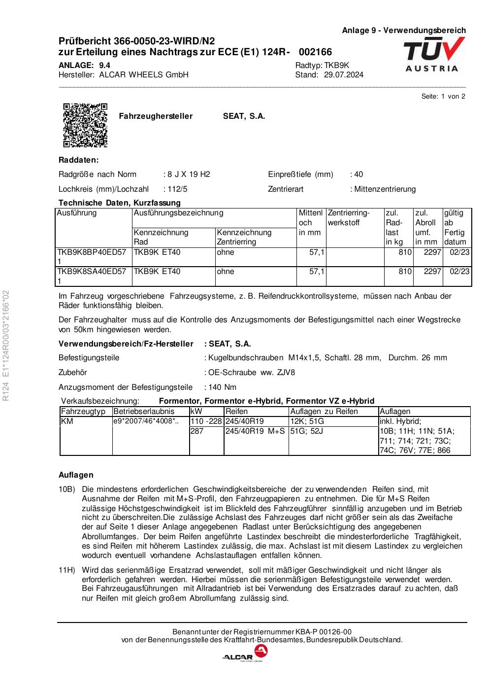 Felgengutachten / ece für Alufelgen alcar TKB9K (8Jx19 ET 0, Mittenloch 0 mm) (Zertifikatsnummer e1-124r00-03-2166-02). Hier kostenlos als PDF herunterladen. Der Download-Link ist 24 Stunden gültig und kann bis zu zwei Mal verwendet werden.