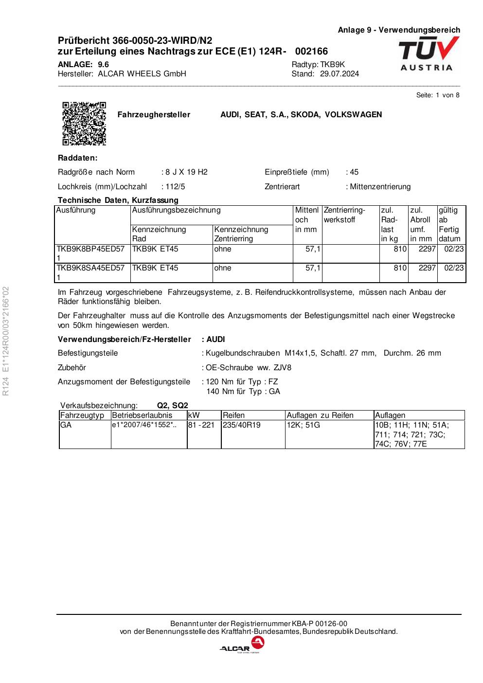 Felgengutachten / ece für Alufelgen alcar TKB9K (8Jx19 ET 0, Mittenloch 0 mm) (Zertifikatsnummer e1-124r00-03-2166-02). Hier kostenlos als PDF herunterladen. Der Download-Link ist 24 Stunden gültig und kann bis zu zwei Mal verwendet werden.