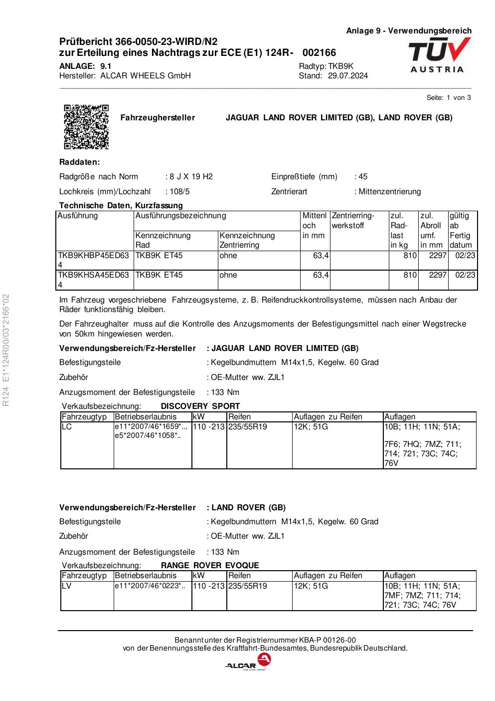 Felgengutachten / ece für Alufelgen alcar TKB9K (8Jx19 ET 0, Mittenloch 0 mm) (Zertifikatsnummer e1-124r00-03-2166-02). Hier kostenlos als PDF herunterladen. Der Download-Link ist 24 Stunden gültig und kann bis zu zwei Mal verwendet werden.