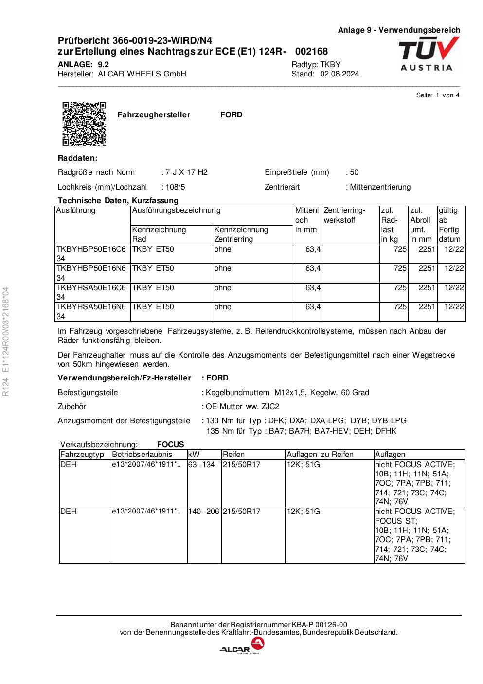 Felgengutachten / ece für Alufelgen alcar TKBY (7Jx17 ET 0, Mittenloch 0 mm) (Zertifikatsnummer e1-124r00-03-2168-04). Hier kostenlos als PDF herunterladen. Der Download-Link ist 24 Stunden gültig und kann bis zu zwei Mal verwendet werden.