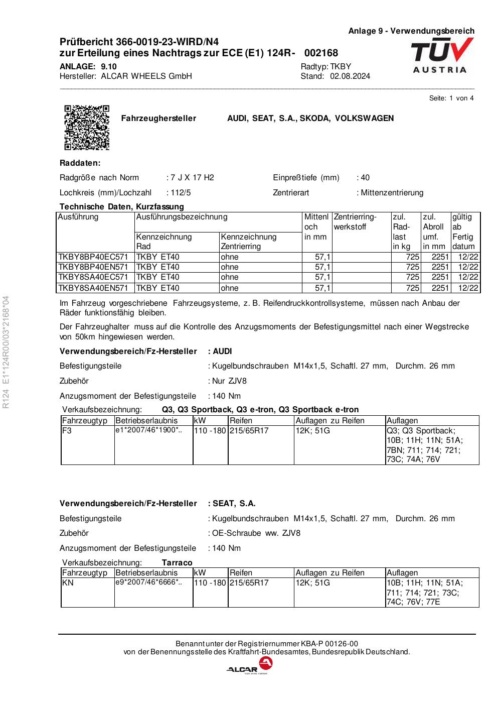 Felgengutachten / ece für Alufelgen alcar TKBY (7Jx17 ET 0, Mittenloch 0 mm) (Zertifikatsnummer e1-124r00-03-2168-04). Hier kostenlos als PDF herunterladen. Der Download-Link ist 24 Stunden gültig und kann bis zu zwei Mal verwendet werden.