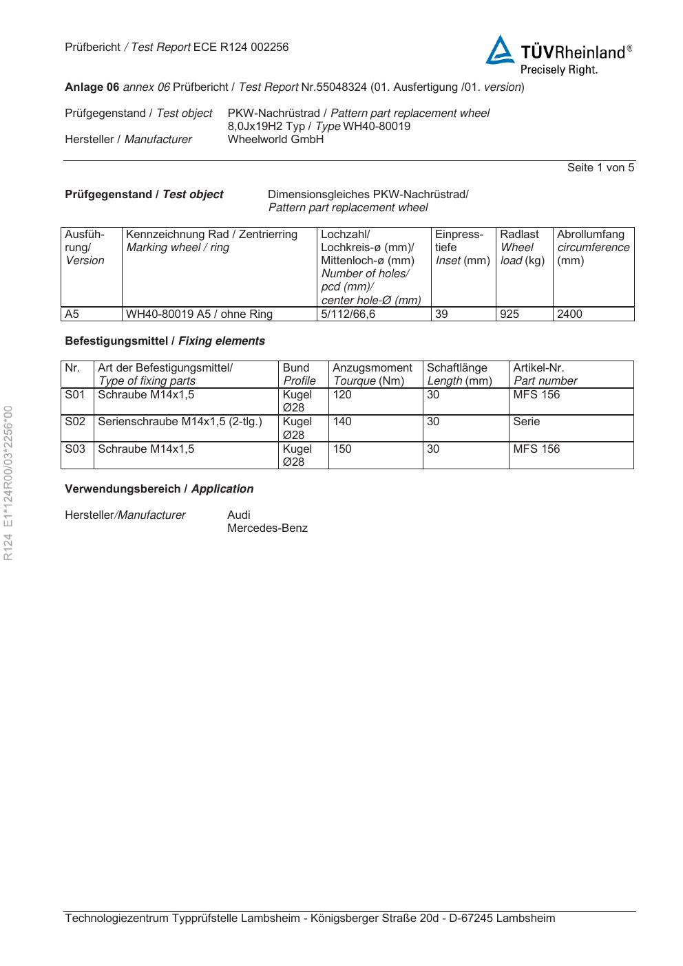 Felgengutachten / ece für Alufelgen Rial WH40-80019 (8Jx19 ET 0, Mittenloch 0 mm) (Zertifikatsnummer e1-124r00-03-2256-00). Hier kostenlos als PDF herunterladen. Der Download-Link ist 24 Stunden gültig und kann bis zu zwei Mal verwendet werden.
