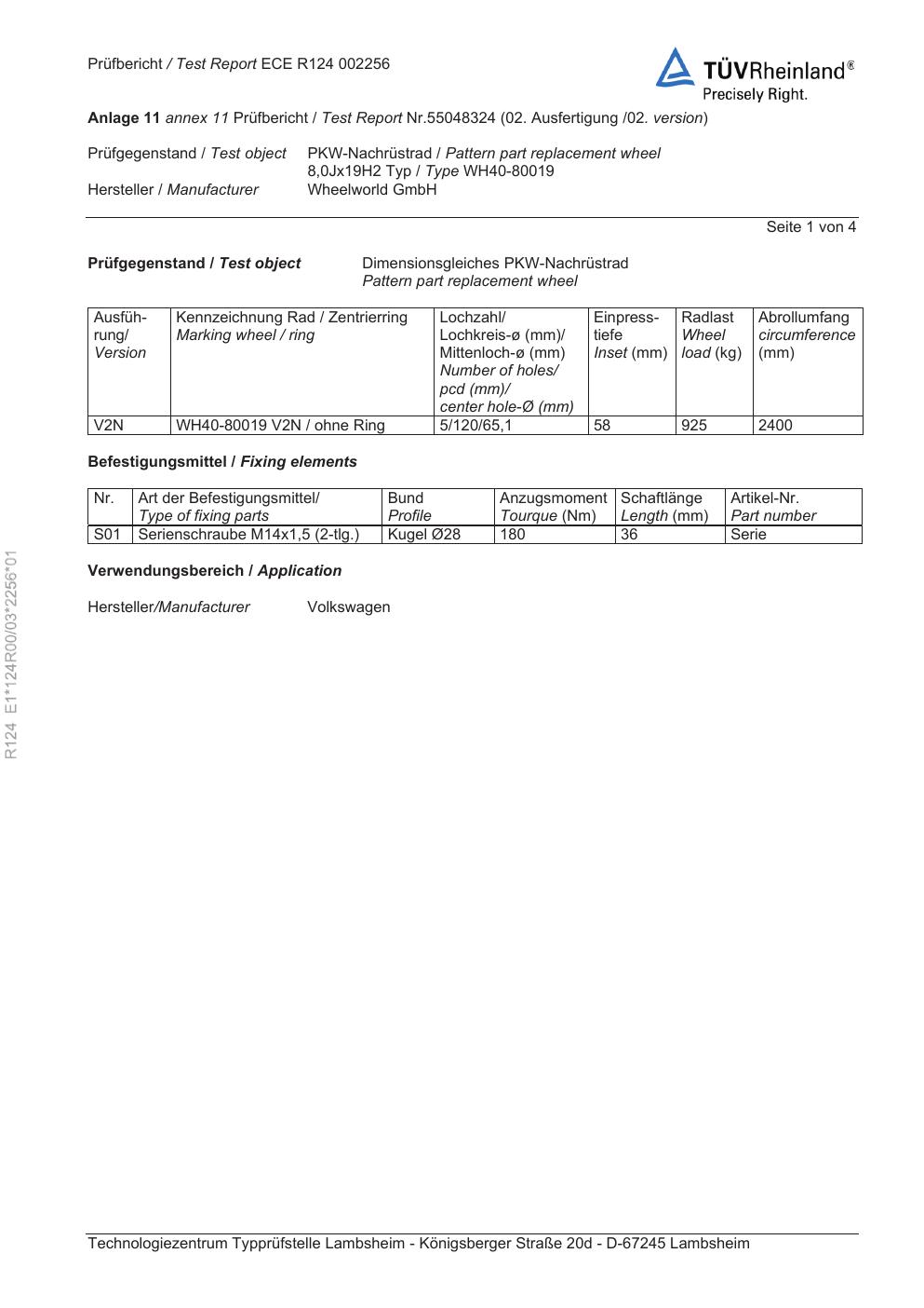 Felgengutachten / ece für Alufelgen Rial WH40-80019 (8Jx19 ET 0, Mittenloch 0 mm) (Zertifikatsnummer e1-124r00-03-2256-01). Hier kostenlos als PDF herunterladen. Der Download-Link ist 24 Stunden gültig und kann bis zu zwei Mal verwendet werden.