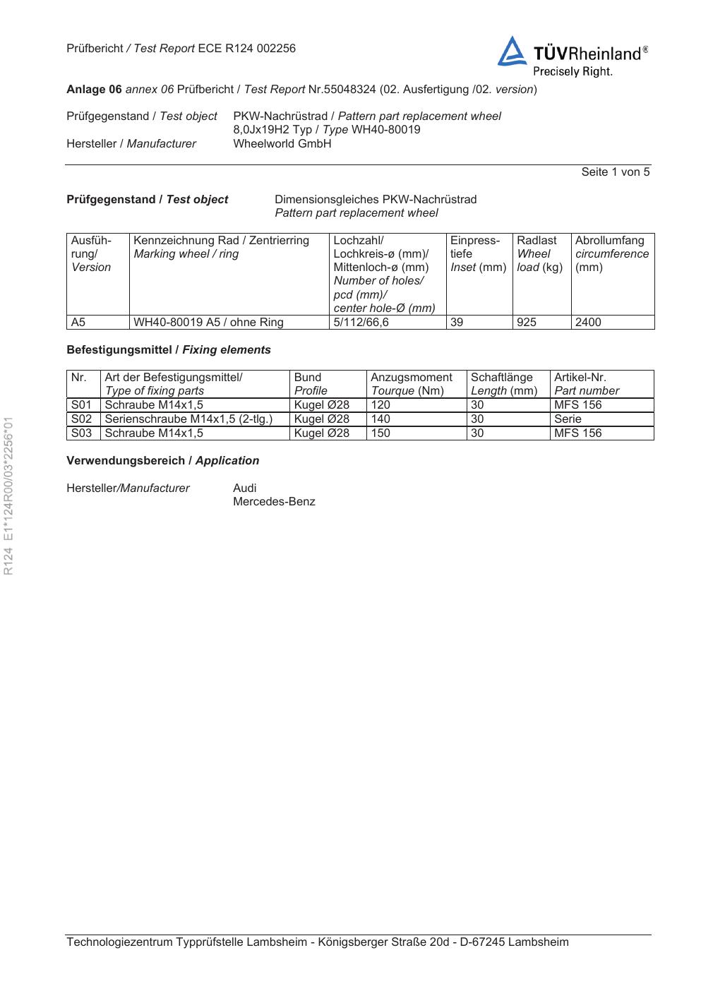 Felgengutachten / ece für Alufelgen Rial WH40-80019 (8Jx19 ET 0, Mittenloch 0 mm) (Zertifikatsnummer e1-124r00-03-2256-01). Hier kostenlos als PDF herunterladen. Der Download-Link ist 24 Stunden gültig und kann bis zu zwei Mal verwendet werden.