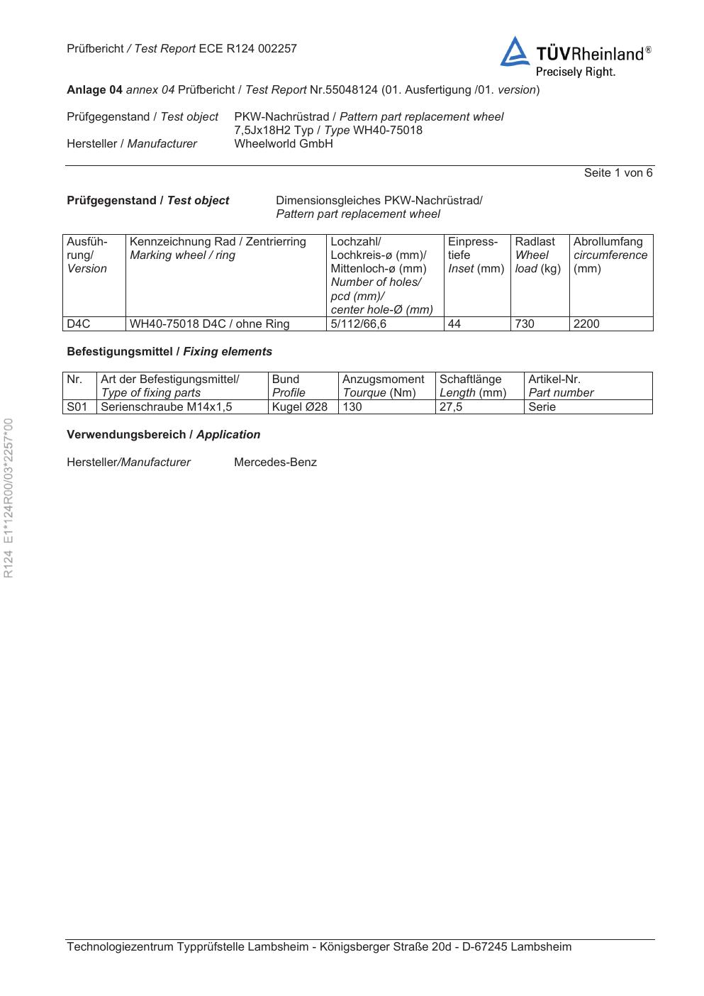 Felgengutachten / ece für Alufelgen Rial WH40-75018 (7.5Jx18 ET 0, Mittenloch 0 mm) (Zertifikatsnummer e1-124r00-03-2257-00). Hier kostenlos als PDF herunterladen. Der Download-Link ist 24 Stunden gültig und kann bis zu zwei Mal verwendet werden.