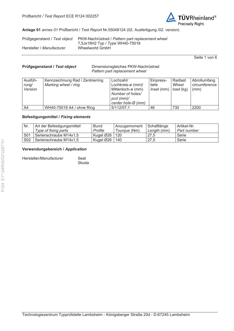 Felgengutachten / ece für Alufelgen Rial WH40-75018 (7.5Jx18 ET 0, Mittenloch 0 mm) (Zertifikatsnummer e1-124r00-03-2257-01). Hier kostenlos als PDF herunterladen. Der Download-Link ist 24 Stunden gültig und kann bis zu zwei Mal verwendet werden.