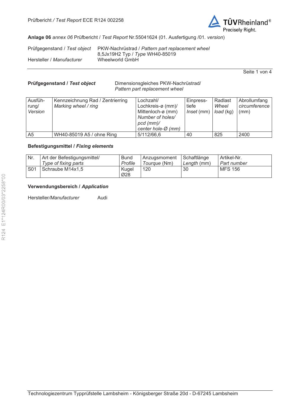 Felgengutachten / ece für Alufelgen Rial WH40-85019 (8.5Jx19 ET 0, Mittenloch 0 mm) (Zertifikatsnummer e1-124r00-03-2258-00). Hier kostenlos als PDF herunterladen. Der Download-Link ist 24 Stunden gültig und kann bis zu zwei Mal verwendet werden.