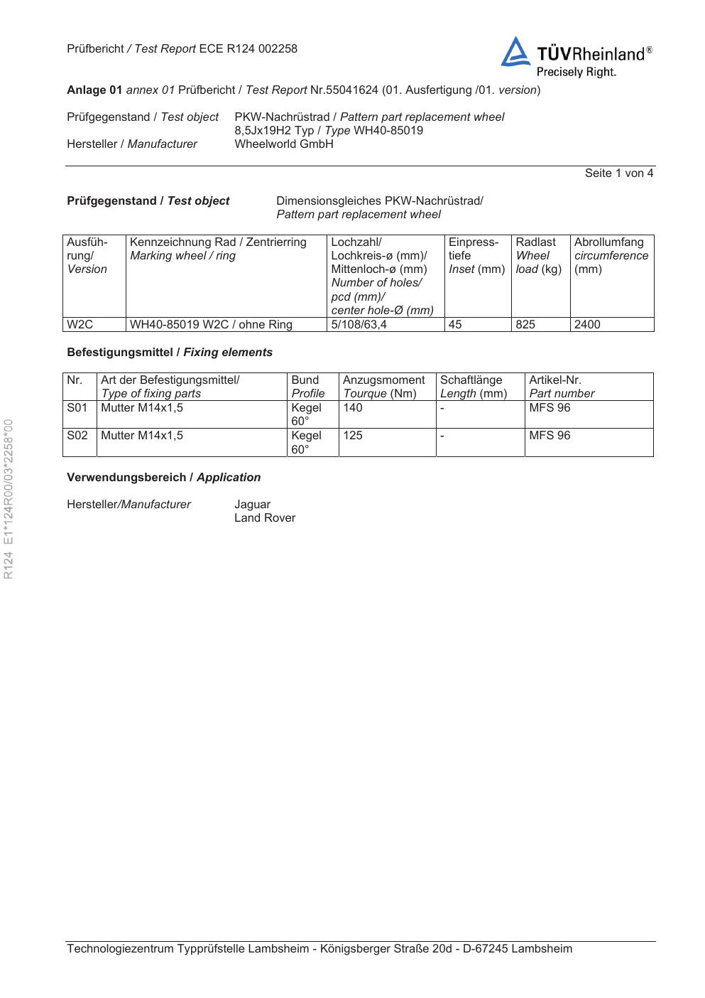 Felgengutachten / ece für Alufelgen Rial WH40-85019 (8.5Jx19 ET 0, Mittenloch 0 mm) (Zertifikatsnummer e1-124r00-03-2258-00). Hier kostenlos als PDF herunterladen. Der Download-Link ist 24 Stunden gültig und kann bis zu zwei Mal verwendet werden.