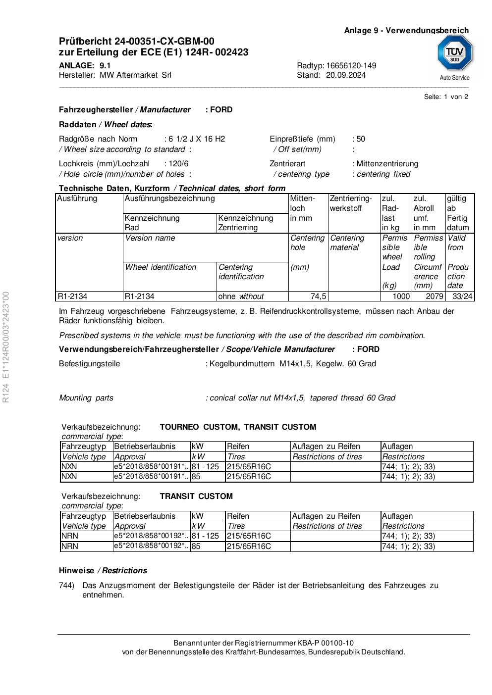 Felgengutachten / ece für Alufelgen Rial 16656120 -149 (2Jx16 ET 0, Mittenloch 0 mm) (Zertifikatsnummer e1-124r00-03-2423-00). Hier kostenlos als PDF herunterladen. Der Download-Link ist 24 Stunden gültig und kann bis zu zwei Mal verwendet werden.