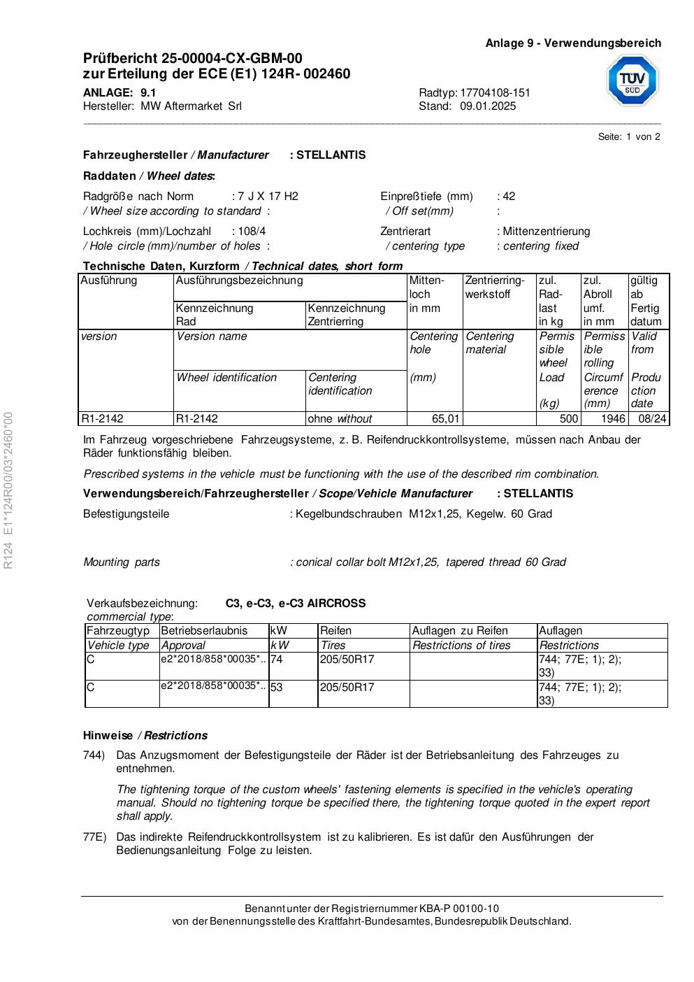 Felgengutachten / ece für Alufelgen Rial 17704108 -151 (7Jx17 ET 0, Mittenloch 0 mm) (Zertifikatsnummer e1-124r00-03-2460-00). Hier kostenlos als PDF herunterladen. Der Download-Link ist 24 Stunden gültig und kann bis zu zwei Mal verwendet werden.