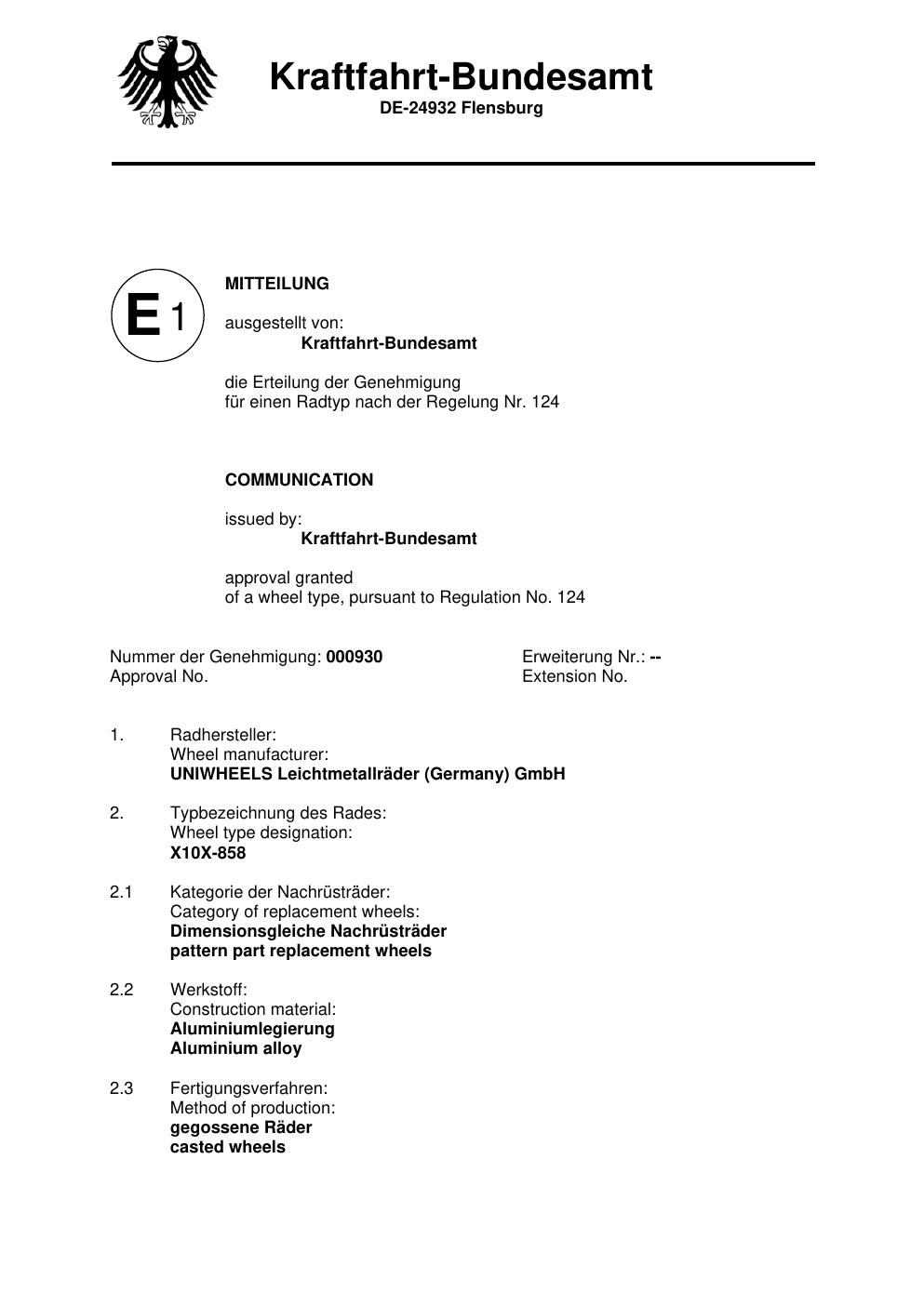 Felgengutachten / ece für Alufelgen Rial X10 (8.5Jx18 ET 0, Mittenloch 0 mm) (Zertifikatsnummer technical-service-responsible-for-carrying-out-the-approval-test-typpr-fstelle-fahrzeuge-fahrzeugteile-der-t-v-rheinland-kraftfa). Hier kostenlos als PDF herunterladen. Der Download-Link ist 24 Stunden gültig und kann bis zu zwei Mal verwendet werden.